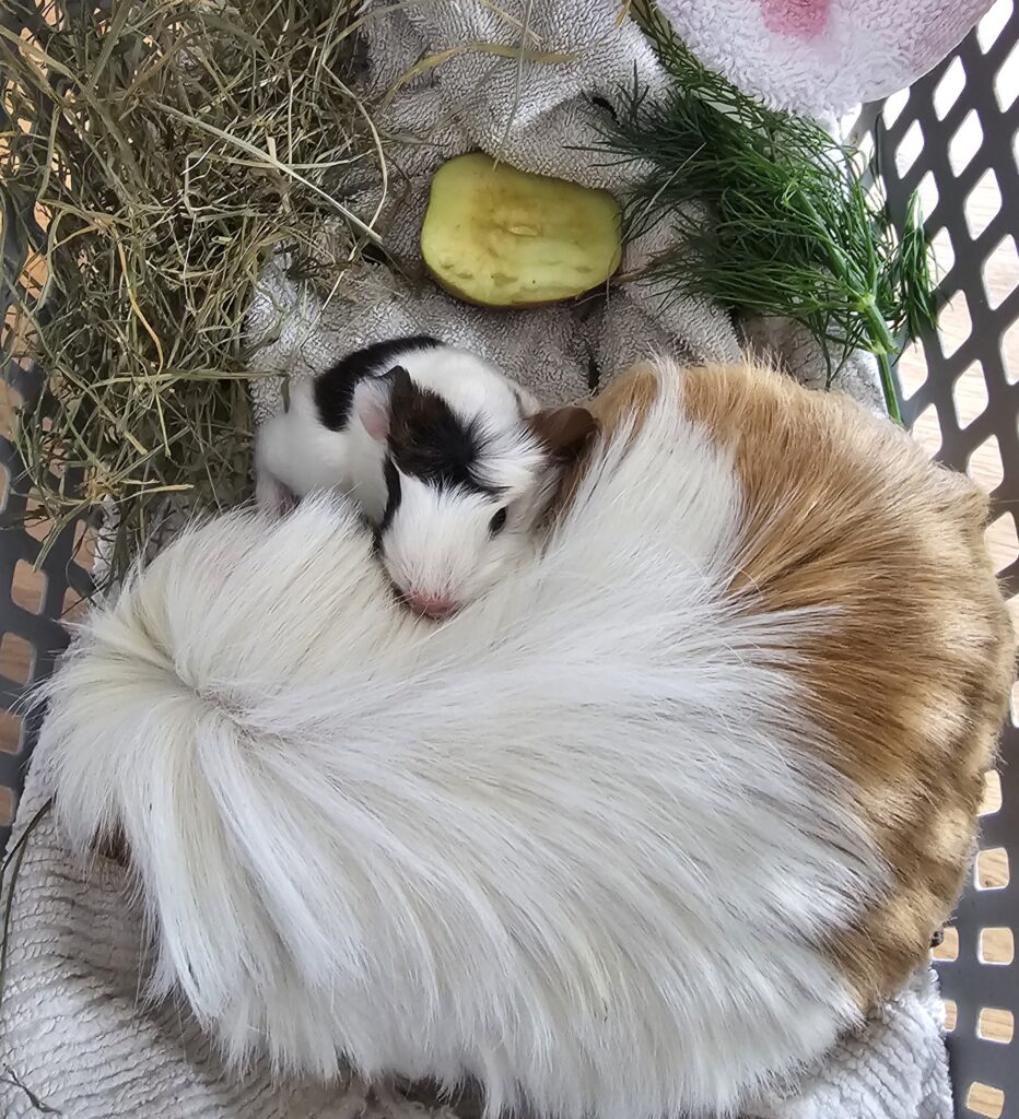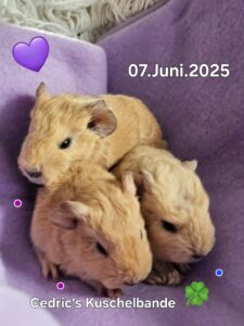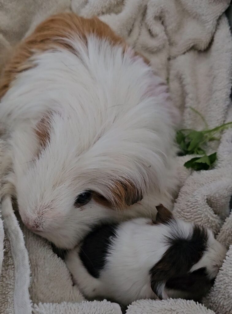 Montag 13.04.26 – 10:12 Uhr: Sophie bekommt jetzt einen Kaiserschnitt, die Wehen sind zu schwach für eine normale Geburt. 😢 Hoffentlich geht alles gut… 11:17 Uhr: Meine TA hat gerade angerufen Sophie hat die OP überstanden, ich bin so glücklich, Sophie schläft noch. 17:01 Uhr: Sophie ist wach, hat schon ein bisschen vom Apfel probiert und Soey, der Name bedeutet „das Leben“ geht es gut. 19 Uhr: Sophie ist noch immer sehr müde von der Narkose, schauen wir wie die nächsten Tage werden. Bitte alle Daumen drücken für unsere Mama und ihr süßes Babylein… 16.April.2026: Sophie und der kleinen Soley geht es soweit gut. Beide Mäuschen müssen sich von dem Stress den ein Kaiserschnitt mit sich bringt erholen, das ist für Mama und Baby ein großer Eingriff. Sophie knabbert fleißig Heu, Gemüse und Kräuter, läuft in der Gruppe ganz normal wieder mit. Soley trinkt fleißig Milch bei Mama und ist mit Mama im Gehege unterwegs, so hoffe ich das letztendlich alles noch gut wird. Aktuelles Bild von heute… ❤️